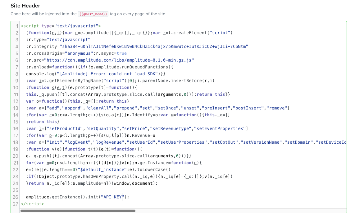 Paste the installation code, with your API key, into the Site Header. It should look something like this: