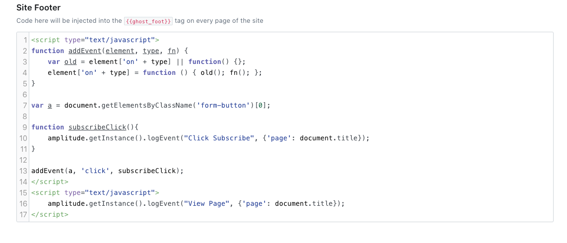 </script>This code will also run every time a page loads, but instead of just firing an event, it looks up the "Subscribe" button element by class, and then attaches a "subscribeClick" function that runs every time that button gets clicked. That function looks up the title of the current page, and sends an event to Amplitude with that title as the same property we used in the "View Page" function.
